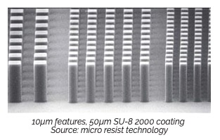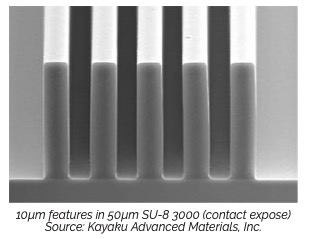 型號(hào):SU-8 3005/SU-8 3010/SU-8 3025/SU-8 3035/SU-8 3050 單層厚度:5~100um 光源:負(fù)性 Near UV(350-400nm),推薦i-Line,也可用于E-beam,X-ray 。 應(yīng)用:光電器件,微流體,MEMS芯片制作以及作為芯片絕緣層、保護(hù)層使用。 特點(diǎn):高寬比大(5:1),SU-8 3000系列較SU-8 2000具有更好的基底粘附力,減少了在工藝過(guò)程中產(chǎn)生內(nèi)應(yīng)力積累。 |