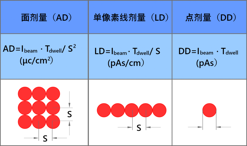 所有工藝和曝光參數(shù)由操作技術確定,這同時也決定了曝光劑量。劑量的概念是建立為所需的入射電子的數(shù)量,以充分顯影特定厚度的電子束光刻膠,這里我們需要區(qū)別曝光圖形的形狀為:面掃描、單像素線(SPL,或者無寬度線)和單點。每種情況下的表達式略有不同(如下圖2所示):