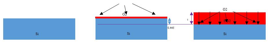 微納加工氧化工藝是在高溫下,襯底的硅直接與O2發(fā)生反應(yīng)生成SiO2,后續(xù)O2通過SiO2層擴(kuò)散到Si/SiO2界面,繼續(xù)與Si發(fā)生反應(yīng)增加SiO2薄膜的厚度,生成1個單位厚度的SiO2薄膜,需要消耗0.445單位厚度的Si襯底;