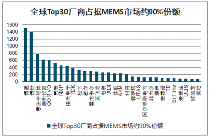 然MEMS產(chǎn)品的總體市場很大,但是由于產(chǎn)品的應(yīng)用領(lǐng)域極其廣泛以及工藝的不統(tǒng)一,各個(gè)細(xì)分市場的規(guī)模很小。每家公司即使占據(jù)1到2個(gè)產(chǎn)品線的領(lǐng)先地位,一般最多只能做到幾億美元的規(guī)模。例如,TI占據(jù)DLP市場,惠普占據(jù)打印機(jī)噴墨頭市場,安華高科技占據(jù)濾波器市場,ADI、ST、飛思卡爾和美新占據(jù)加速度計(jì)市場,樓氏占據(jù)麥克風(fēng)市場,這些企業(yè)在單個(gè)市場占據(jù)很大的市場份額